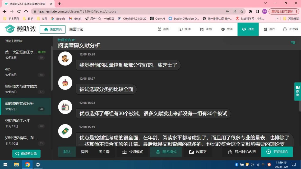 课前,蒋霞霞老师在《认知心理学》课程学习QQ群中共享了三篇有关心理旋转的前沿文献发,并提出问题,让大家带着问题提前阅读学习并思考。课堂上,蒋霞霞老师简要介绍了三篇文献与课程内容的联系,并强调如何把课本的知识与中小学的研究和实践联系起来。随后,师生们在微助教学习平台上开展了班级讨论,同学们积极参与。